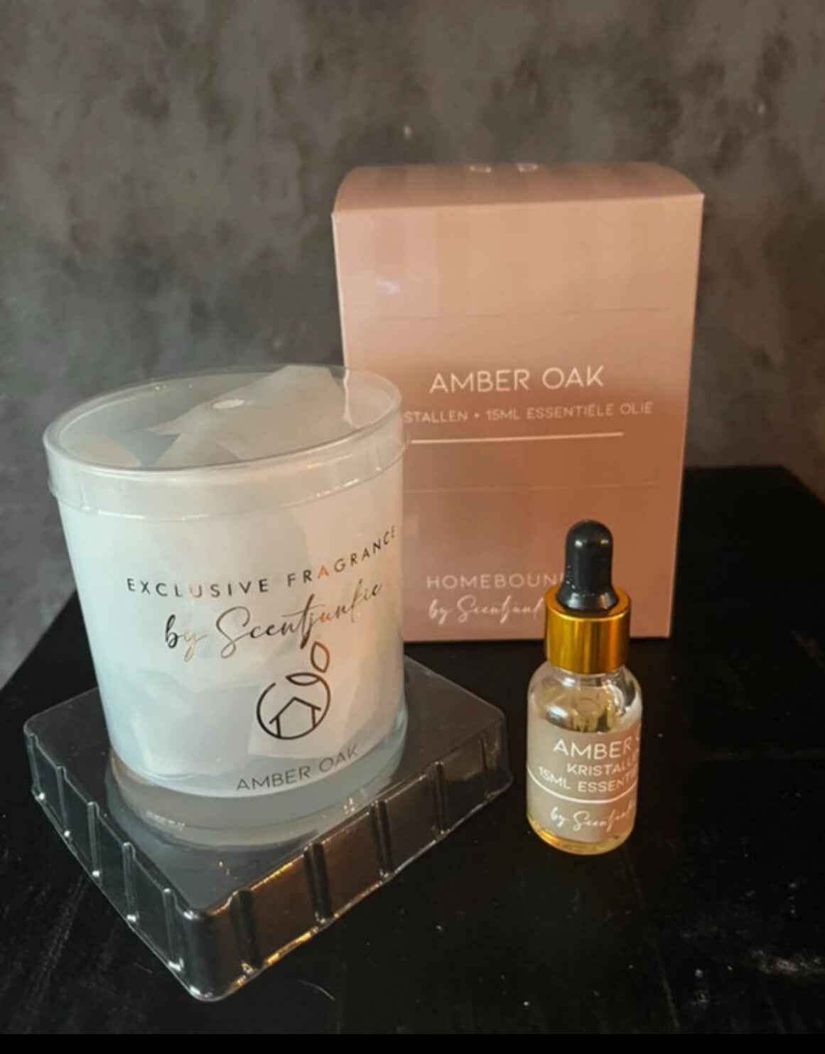 Betreed een wereld van luxe en warmte met de Amber Oak geur kristallen. Deze krachtige, aardse geur combineert de rijke tonen van amber met de robuuste geur van eikenhout, waardoor je ruimte transformeert in een sfeervolle oase.